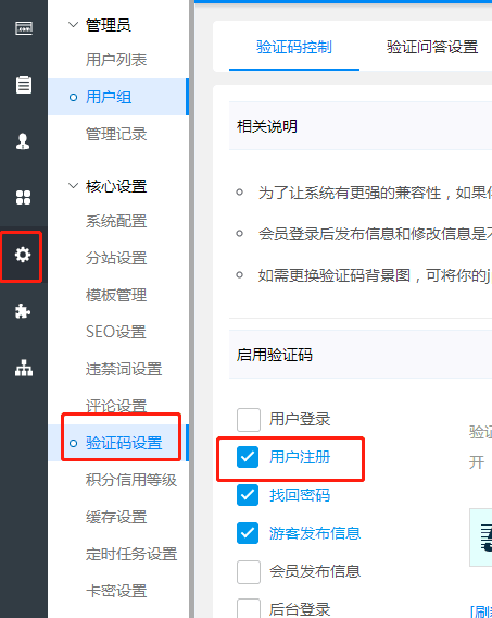 如果您的站點未在注冊頁面開啟驗證碼的話,有可能會造成短信無法正常發送,因此需要您在后臺-》系統-》核心設置-》驗證碼設置-》用戶注冊-》啟用驗證碼-》提交。