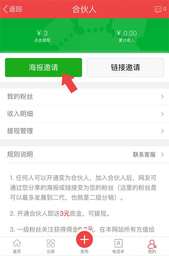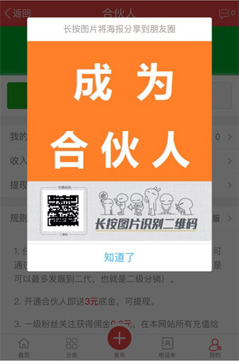 2,好友掃碼(長按識別二維碼)關注后,會成為你的粉絲。每個關注得傭金0.3元,粉絲在網(wǎng)站上的消費也有30%的傭金,如:粉絲購買了一個月的置頂,費用100元,你得到傭金30元